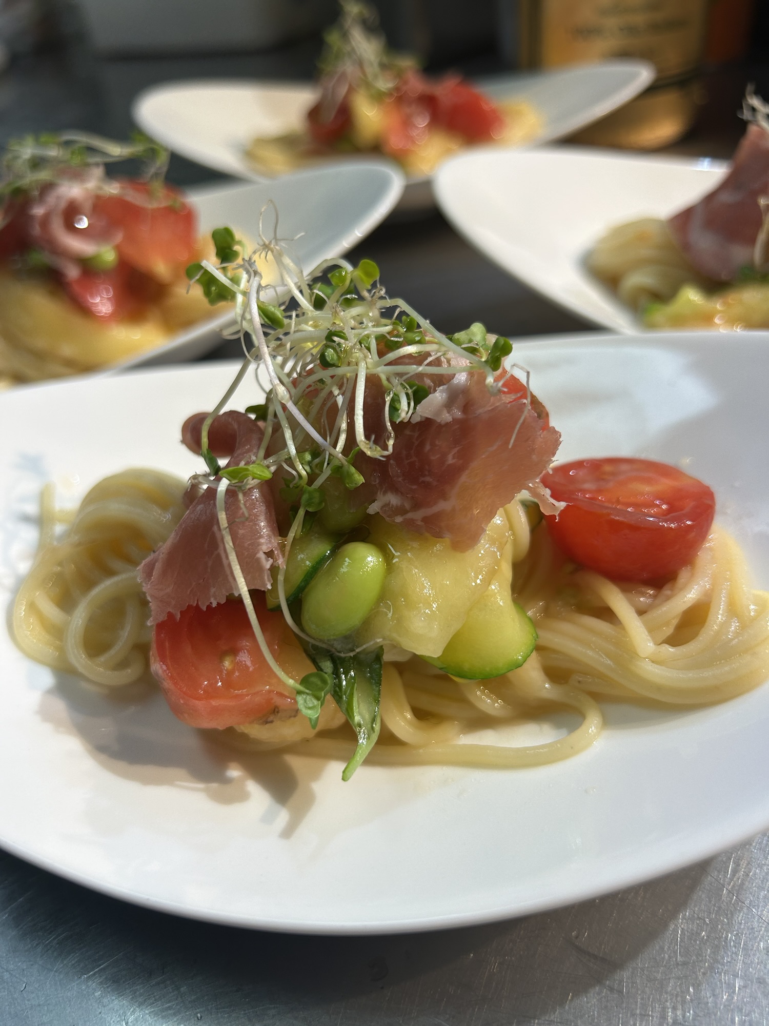 豚の頬肉のサラミと、枝豆。レモンの酸味を少し聞かせ、さっぱりとした甘みのあるパスタです