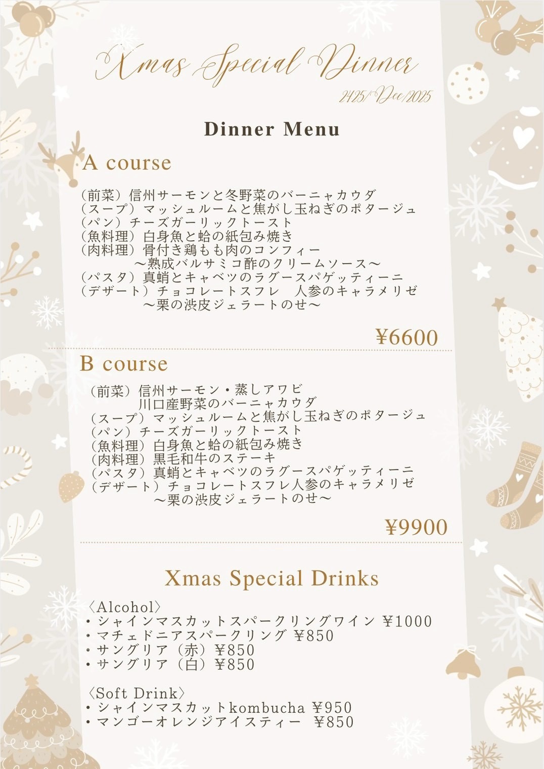 0363は本日と明日二日間はクリスマス特別ディナーコースをご用意いたします(アラカルトはございません。)