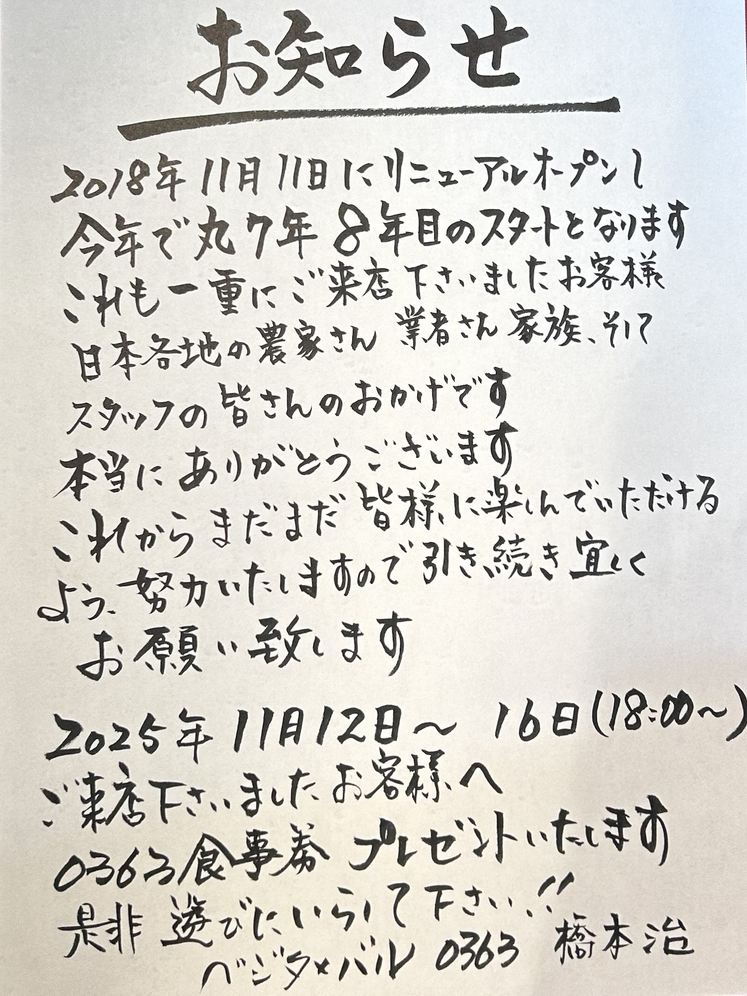 感謝祭としまして、今週1週間、ディナータイムにご来店いただきますと、もれなく0363で使えるお食事券をプレゼントいたします!
