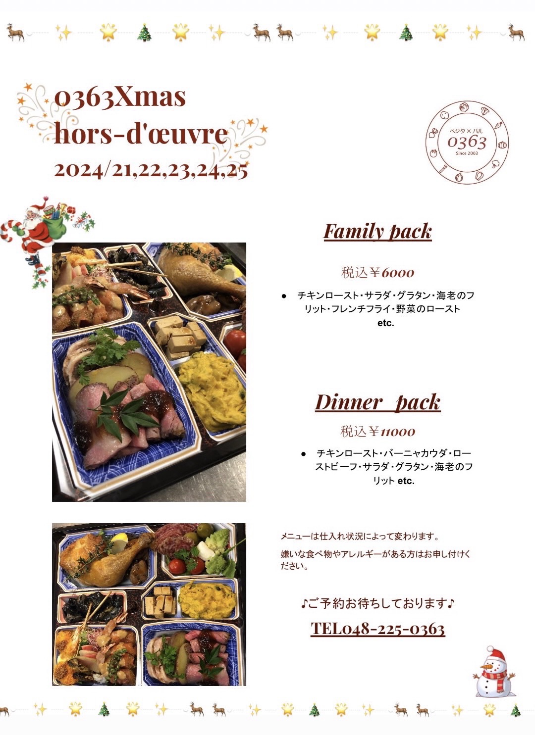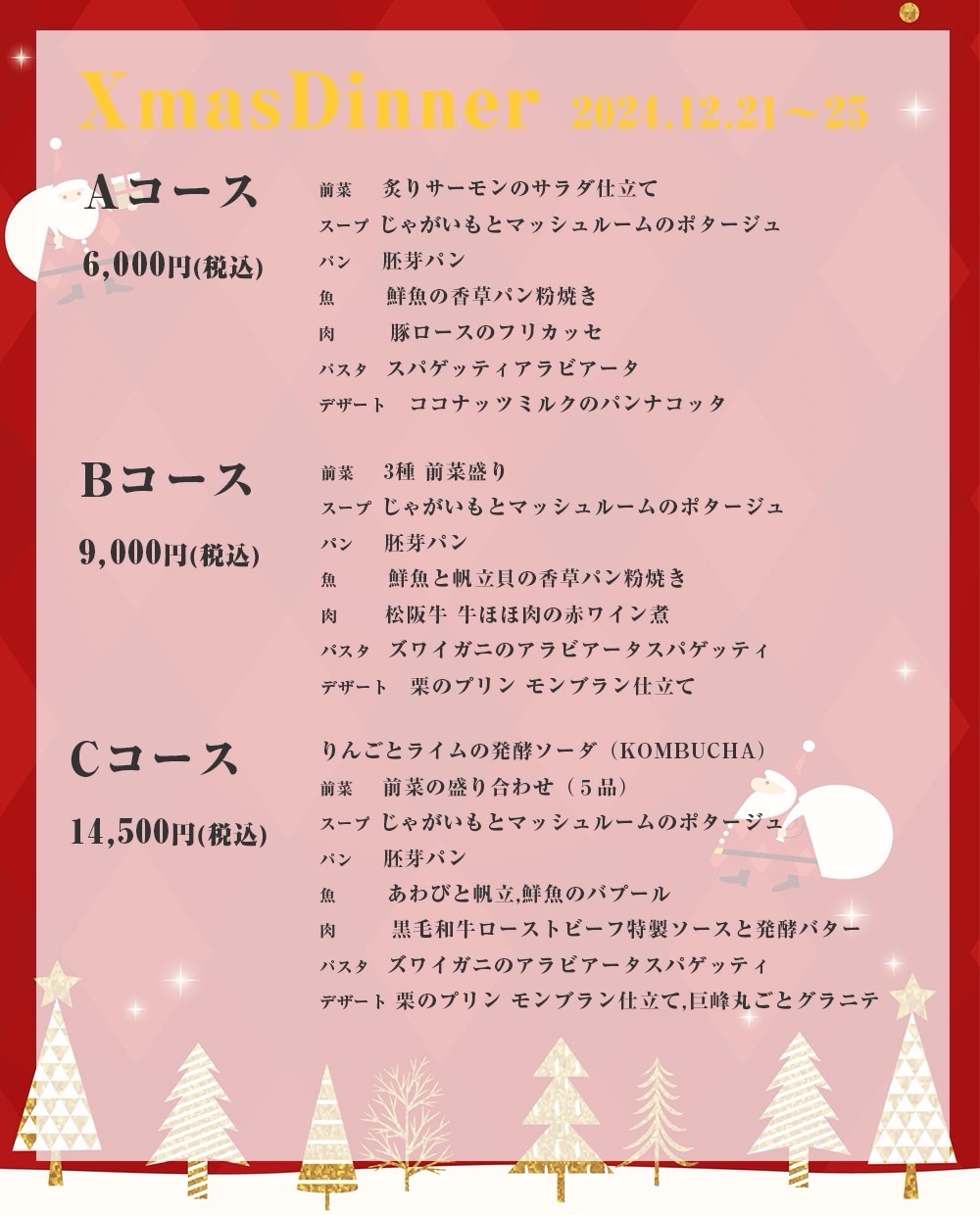 クリスマスのオードブルやクリスマスディナーコースも若干余裕がございますので、そちらもぜひよろしくお願いいたします。