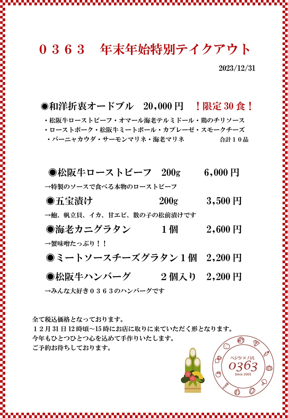 年明けは1月 5日17時より営業いたしますので、ぜひ遊びにいらしてください。お正月特別メニューとなりますが、おいしいものをご用意してお待ちしておりますので、来年もまたぜひ0363を壁ってください。よろしくお願いいたします。